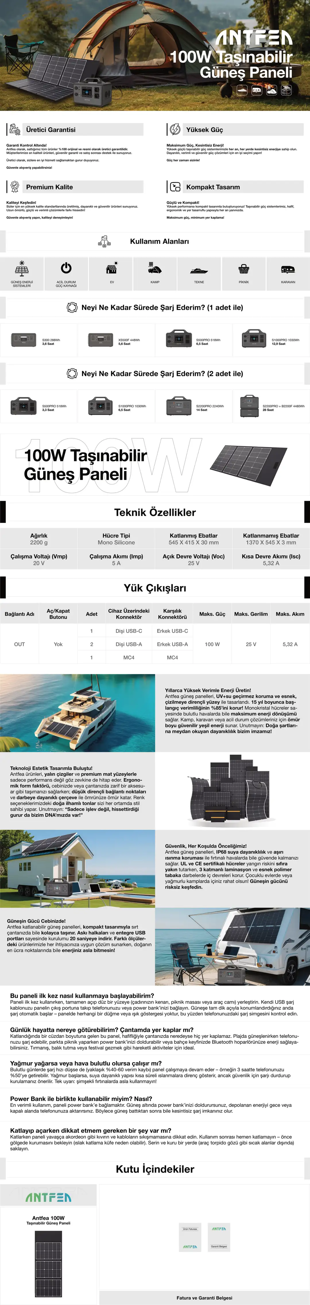Antfea 100W Taşınabilir Güneş Paneli, kamp, karavan, tekne ve acil durumlar için hafif, kompakt ve yüksek verimli enerji çözümü sunar. Katlanabilir tasarımı ve taşınabilir yapısı sayesinde çantanızda veya araç bagajınızda kolayca taşınabilir. Aç-kullan mantığı ile saniyeler içinde kurulum yapabilirsiniz.