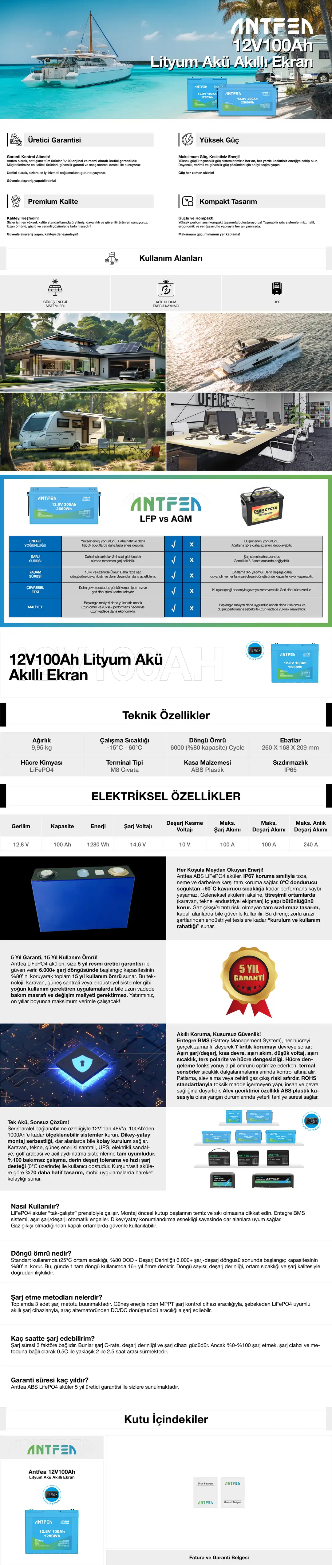 - Model: Antfea 12.8V 100Ah Mavi LiFePO4