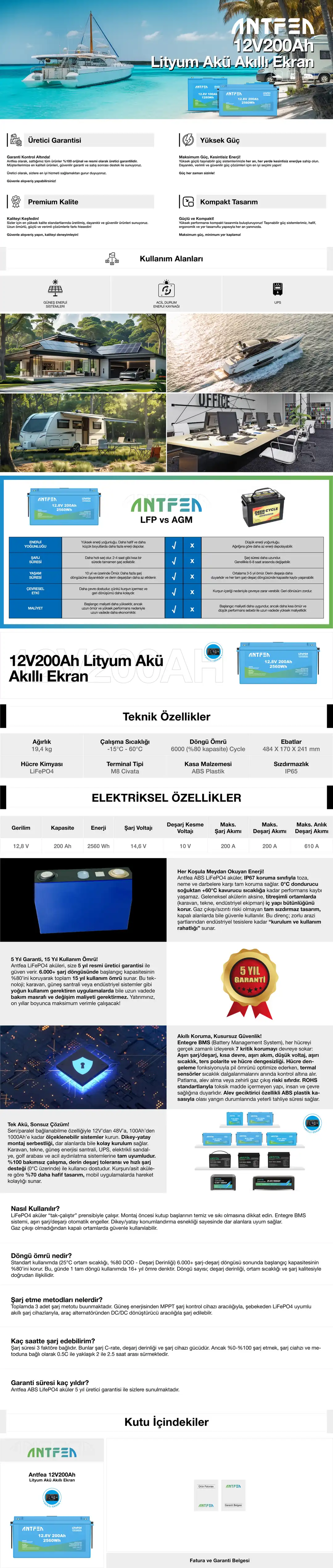 ANTFEA 12.8V 200Ah LiFePO4 Akü (2 Adet) toplamda 12.8V 400Ah yüksek kapasiteli enerji depolama sunar. Karavan, tiny house, tekne, off-grid güneş enerjisi sistemleri ve acil durum güç çözümleri için profesyonel seviyede performans sağlar.