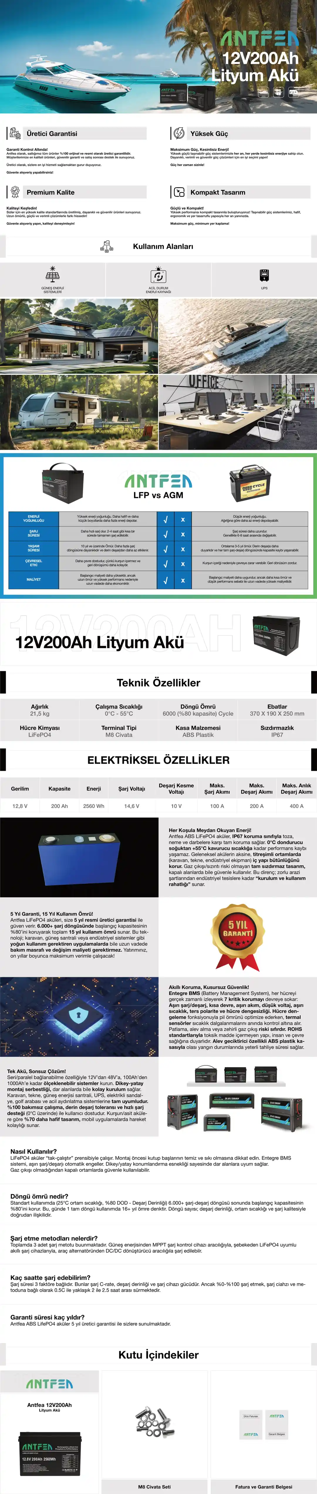 Antfea 12.8V 200Ah ABS LiFePO4 Lityum Akü, yüksek kapasiteli ve uzun ömürlü enerji depolama ihtiyacı olan kullanıcılar için tasarlanmış güçlü bir çözümdür. 2.56 kWh enerji kapasitesi ile karavan, tekne, güneş enerjisi ve off-grid sistemlerinde kesintisiz ve güvenli performans sunar.