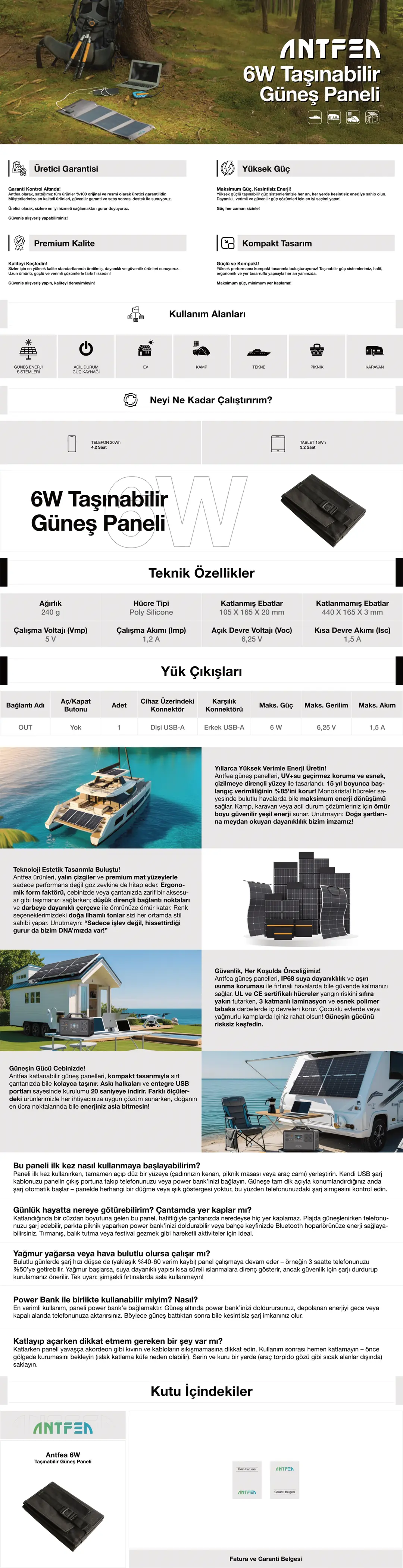 Antfea 6W Taşınabilir Güneş Paneli | Kamp ve Outdoor Solar Şarj Paneli
