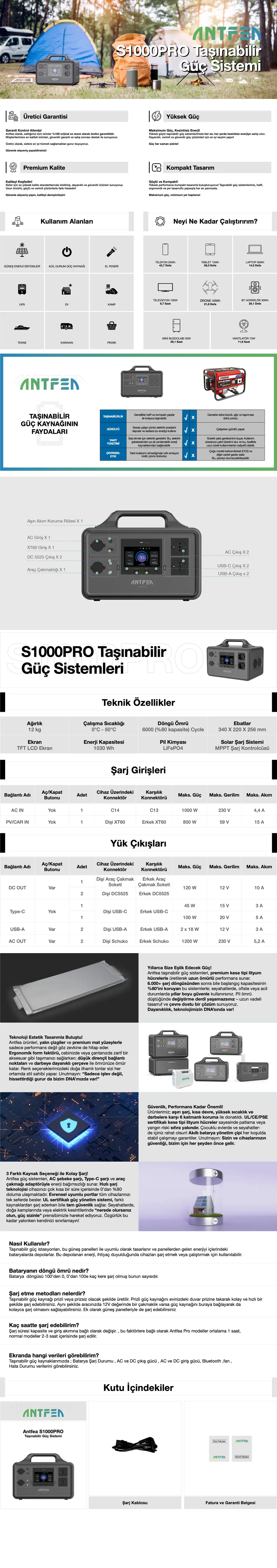 Antfea S1000Pro Taşınabilir Güç Sistemi 1000W + 100W Taşınabilir Güneş Paneli Seti