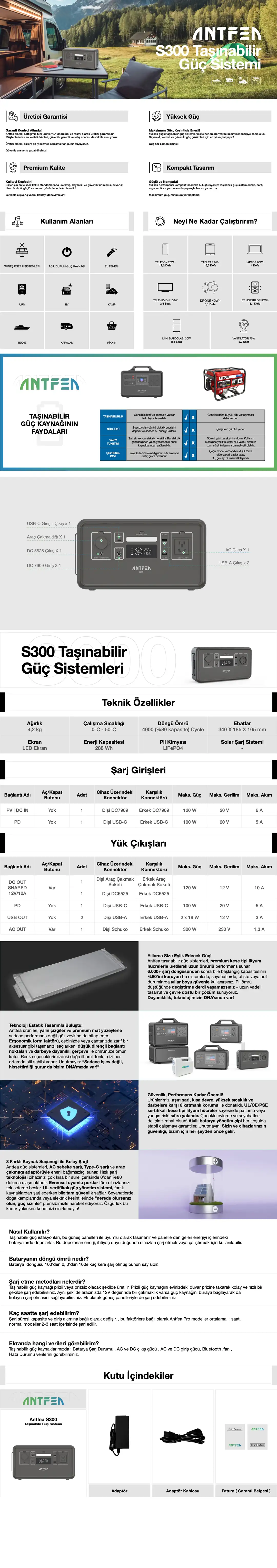 Antfea S300 Mini 300W Taşınabilir Güç Kaynağı + 30W Taşınabilir Güneş Paneli, kamp, karavan, outdoor aktiviteler ve acil durumlar için pratik ve çevre dostu bir enerji çözümüdür. Kompakt tasarımı, hafif yapısı ve çoklu çıkış seçenekleri sayesinde dilediğiniz yerde güvenli enerji sağlar.