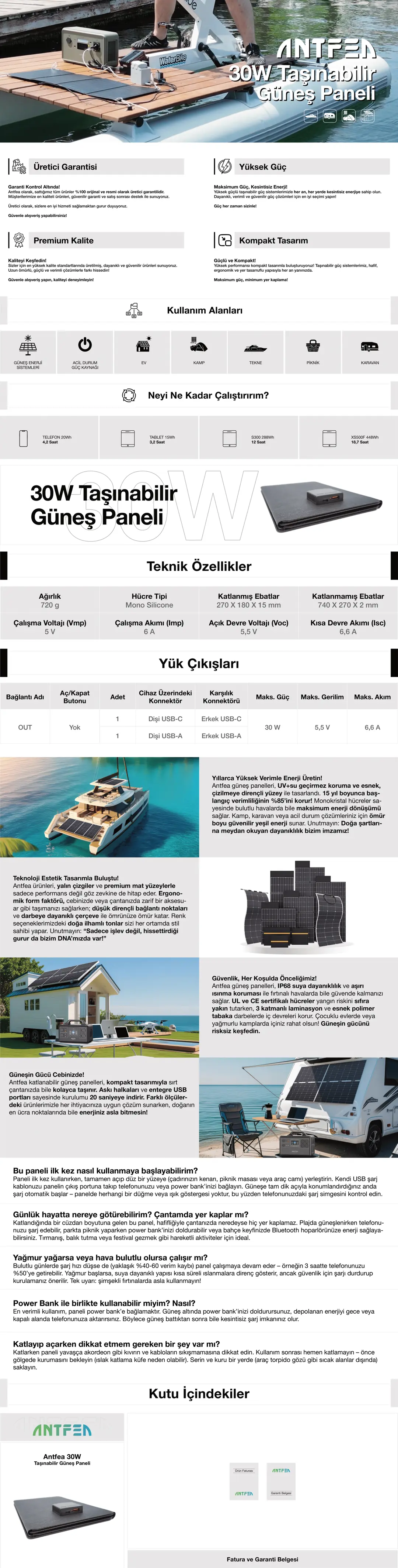 30W Taşınabilir Güneş Paneli Özellikleri